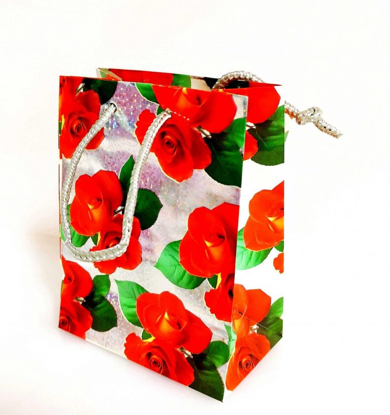 שקית נייר קטנה פרחים אדומים רקע כסף